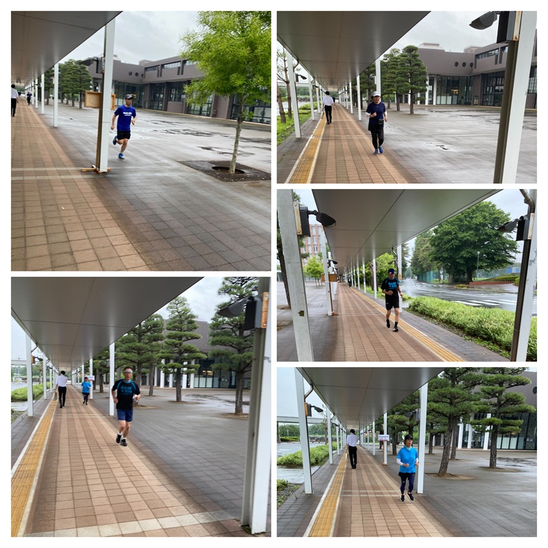 ④メイン練習は、通路下とアカデミックキューブ軒下に片道300mのコースを設定し、50~80mの急走区間を設け、2400~3600mの変化走をしました。