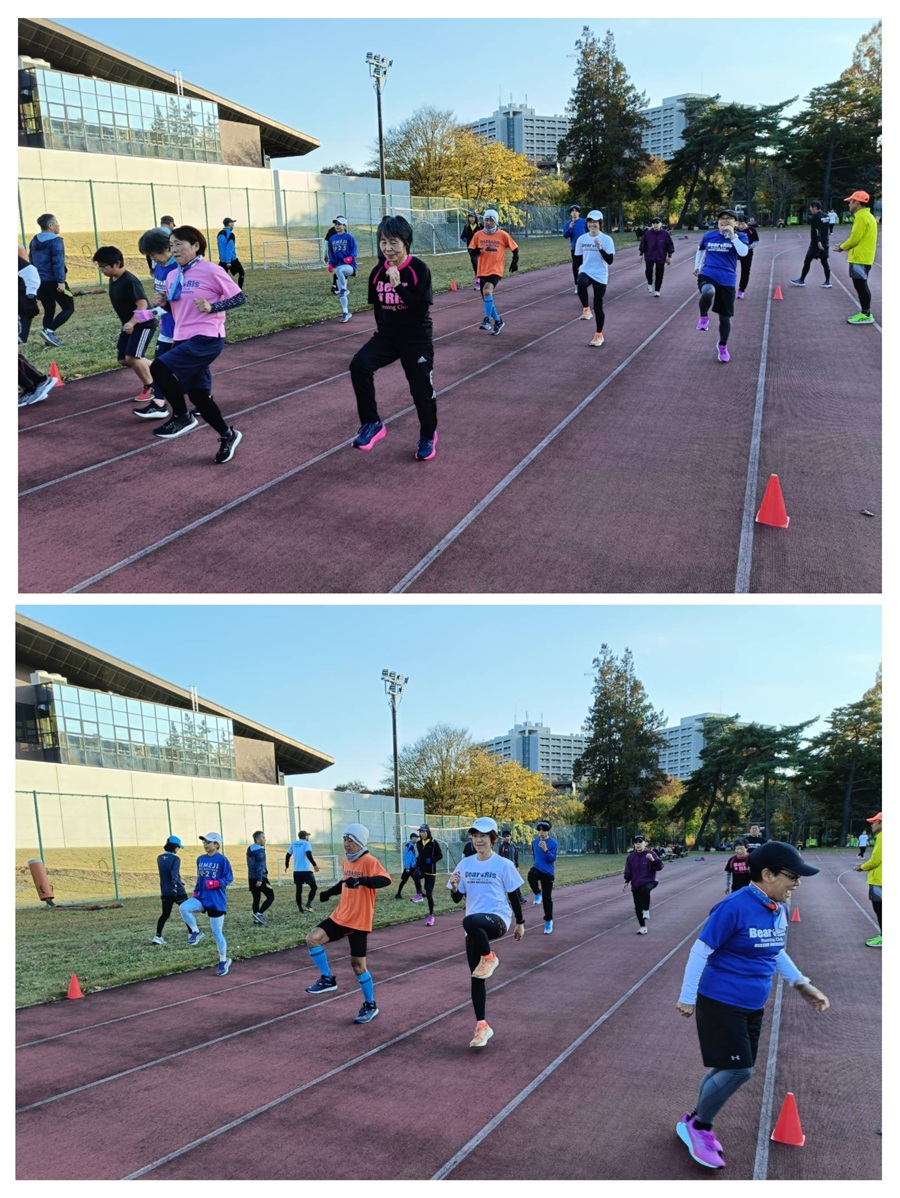 ②ウォーミングアップのエクササイズの後、スキップ系の動き作りで脚の動きがスムーズになるようにしました。メイン練習はアドバンスが5000mのタイムトライアルを行い、心肺と脚筋に刺激を入れるとともに現状を確認しました。ベーシックはラン250m+ウォーク150mを13回行い、前回よりも長く走り続けられるようにしました。